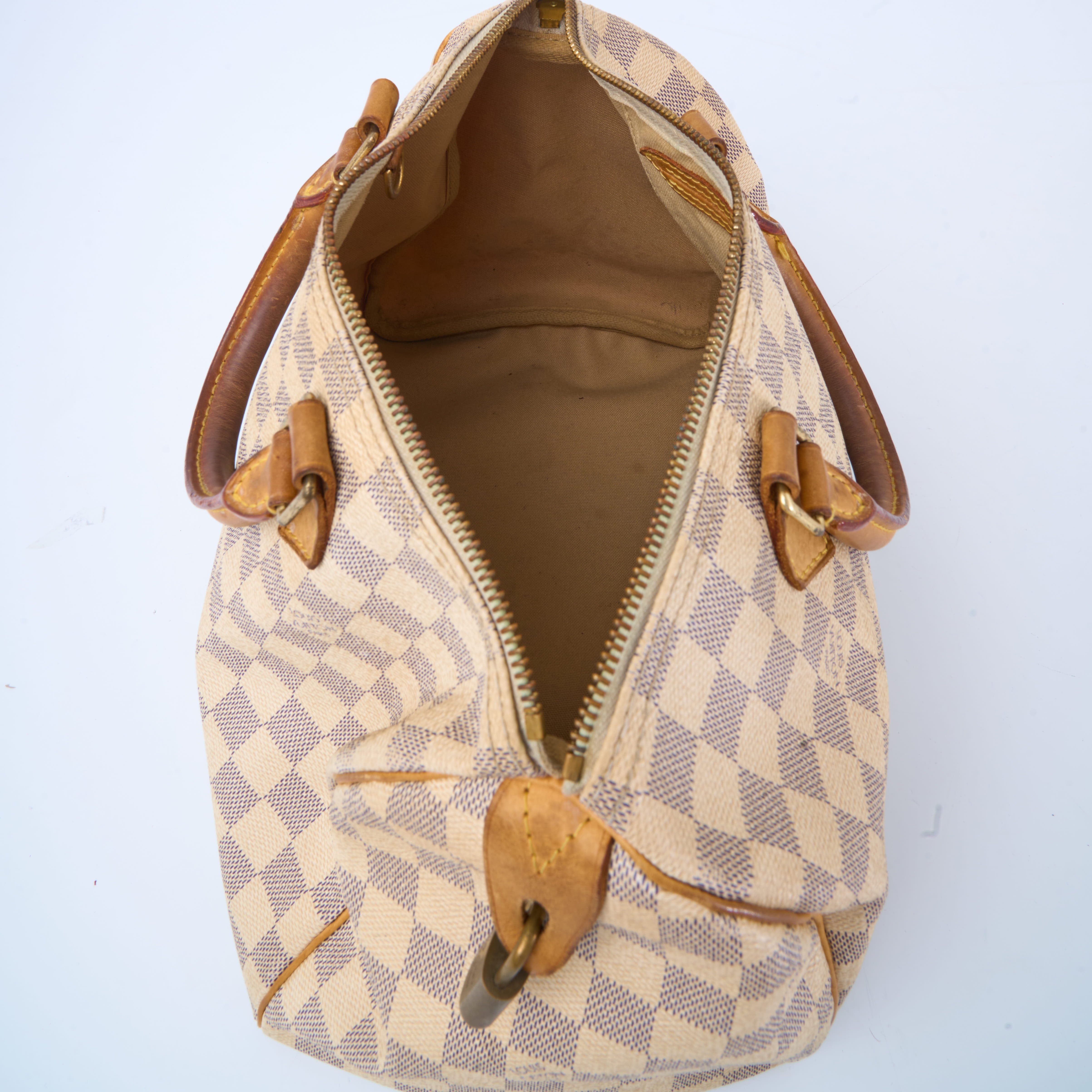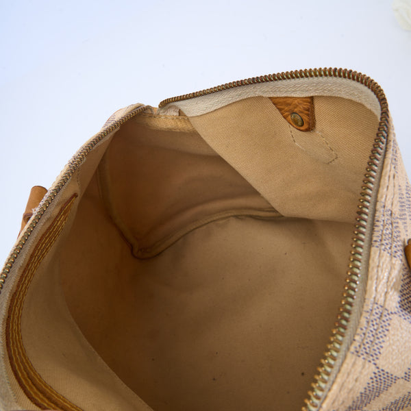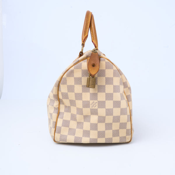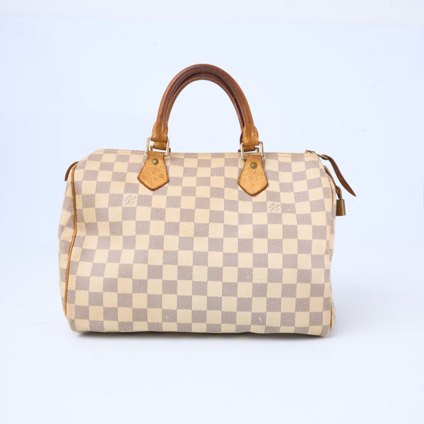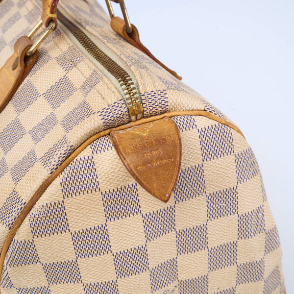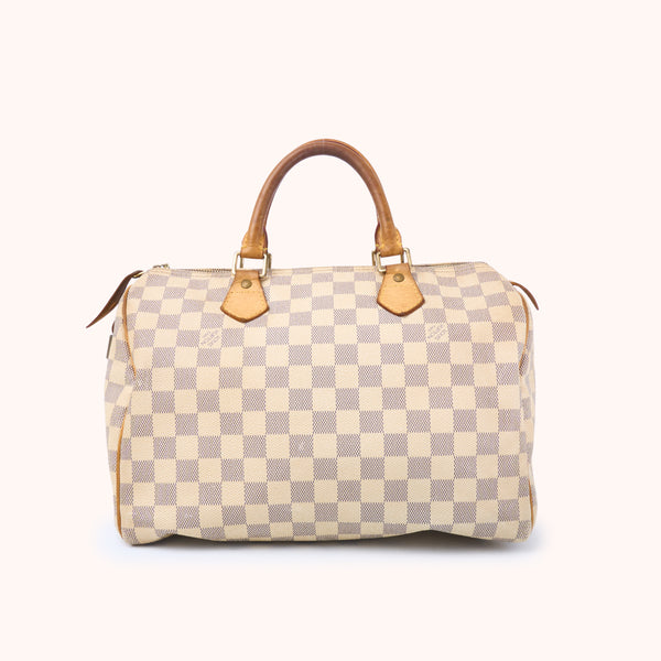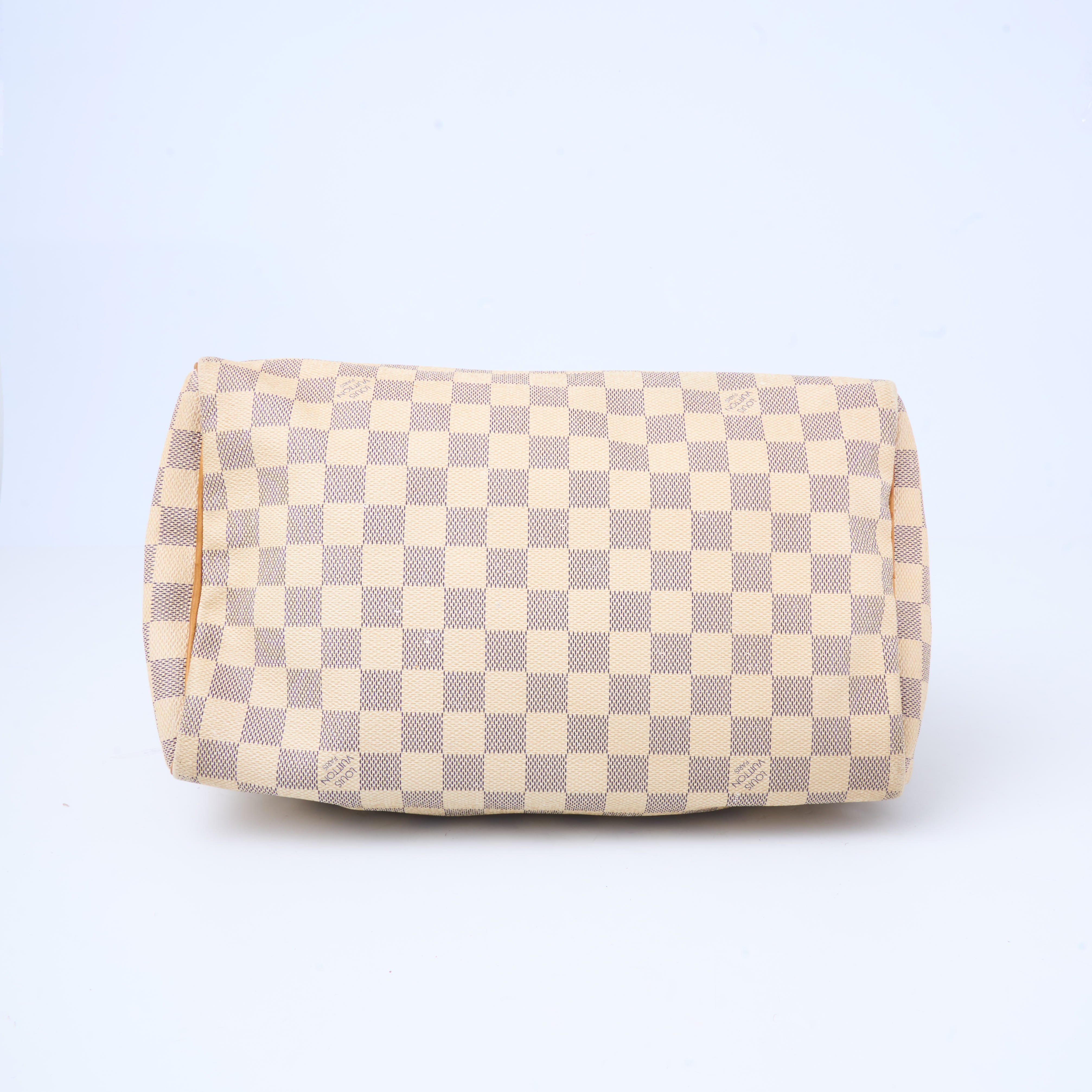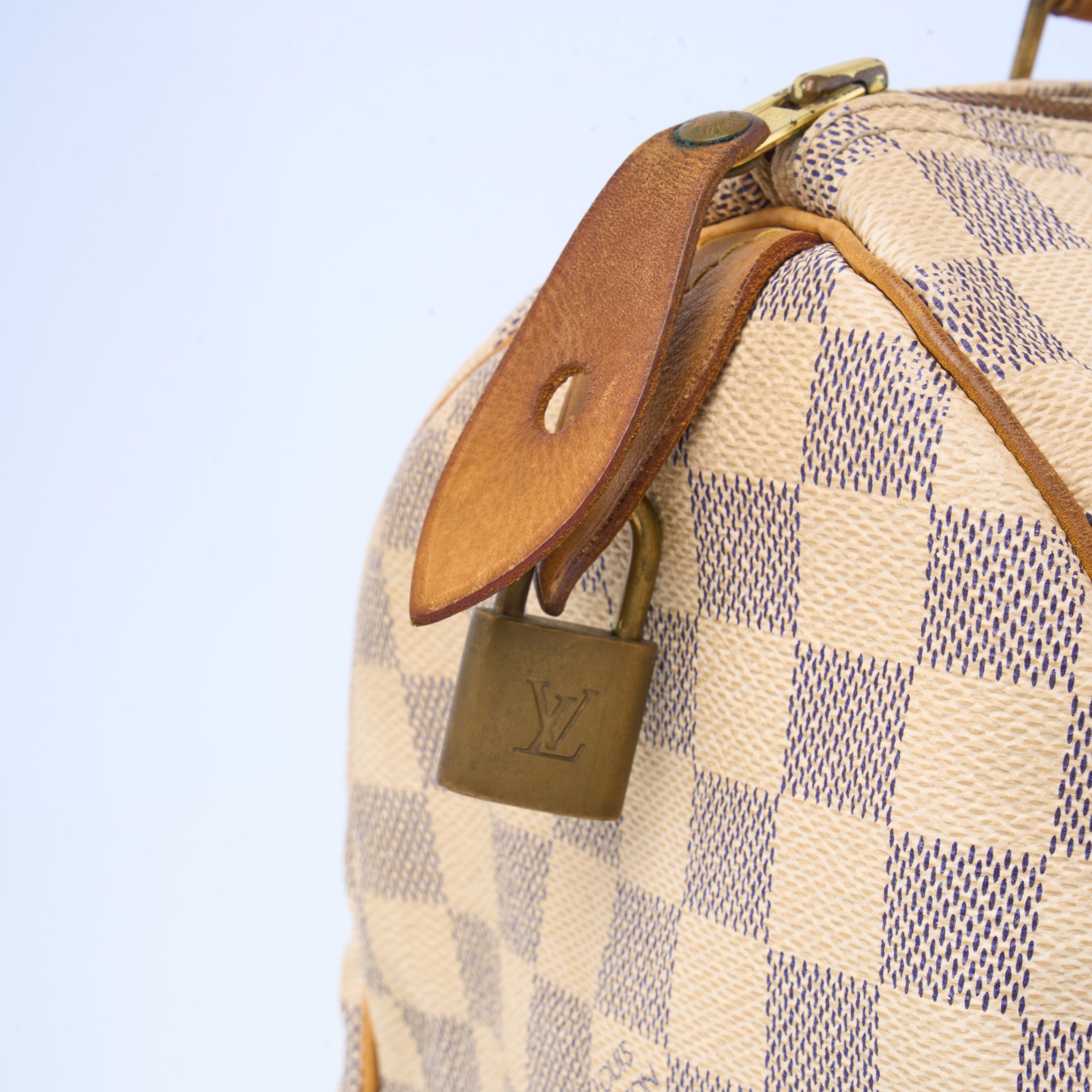 Die Speedy 30 ist eine Ikone unter den Handtaschen – ursprünglich inspiriert vom Reisekoffer „Keepall“, wurde sie als elegante City-Bag entworfen. In dieser Ausführung präsentiert sie sich im sommerlich-frischen Damier Azur Canvas, kombiniert mit edlen Vachetta-Lederdetails, die mit der Zeit eine schöne Patina entwickeln.