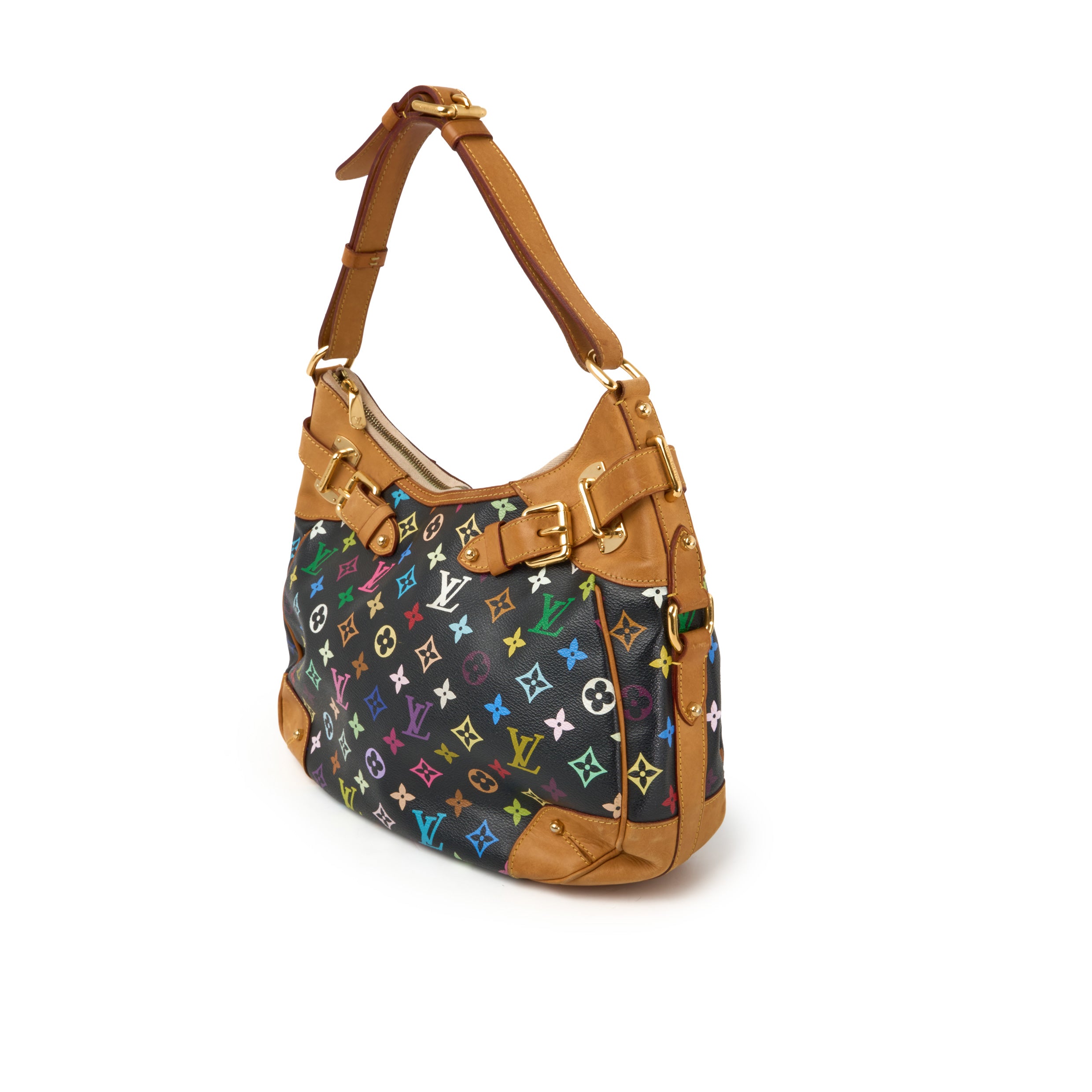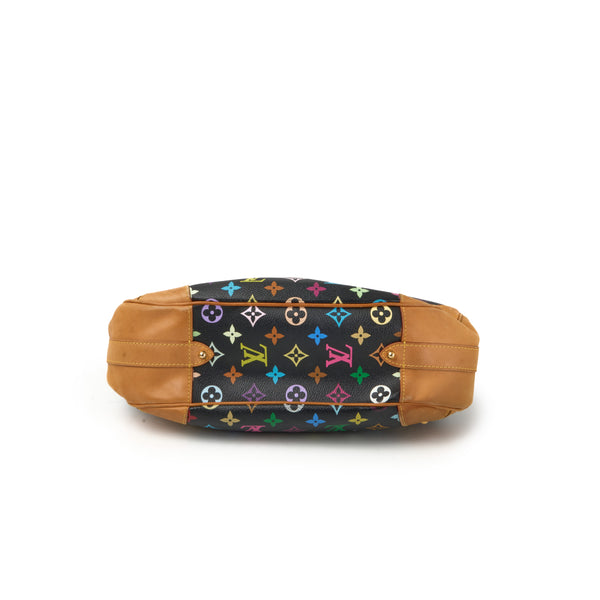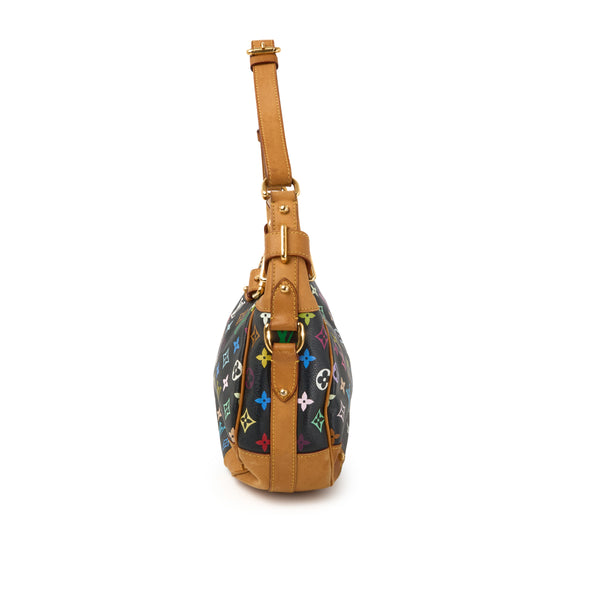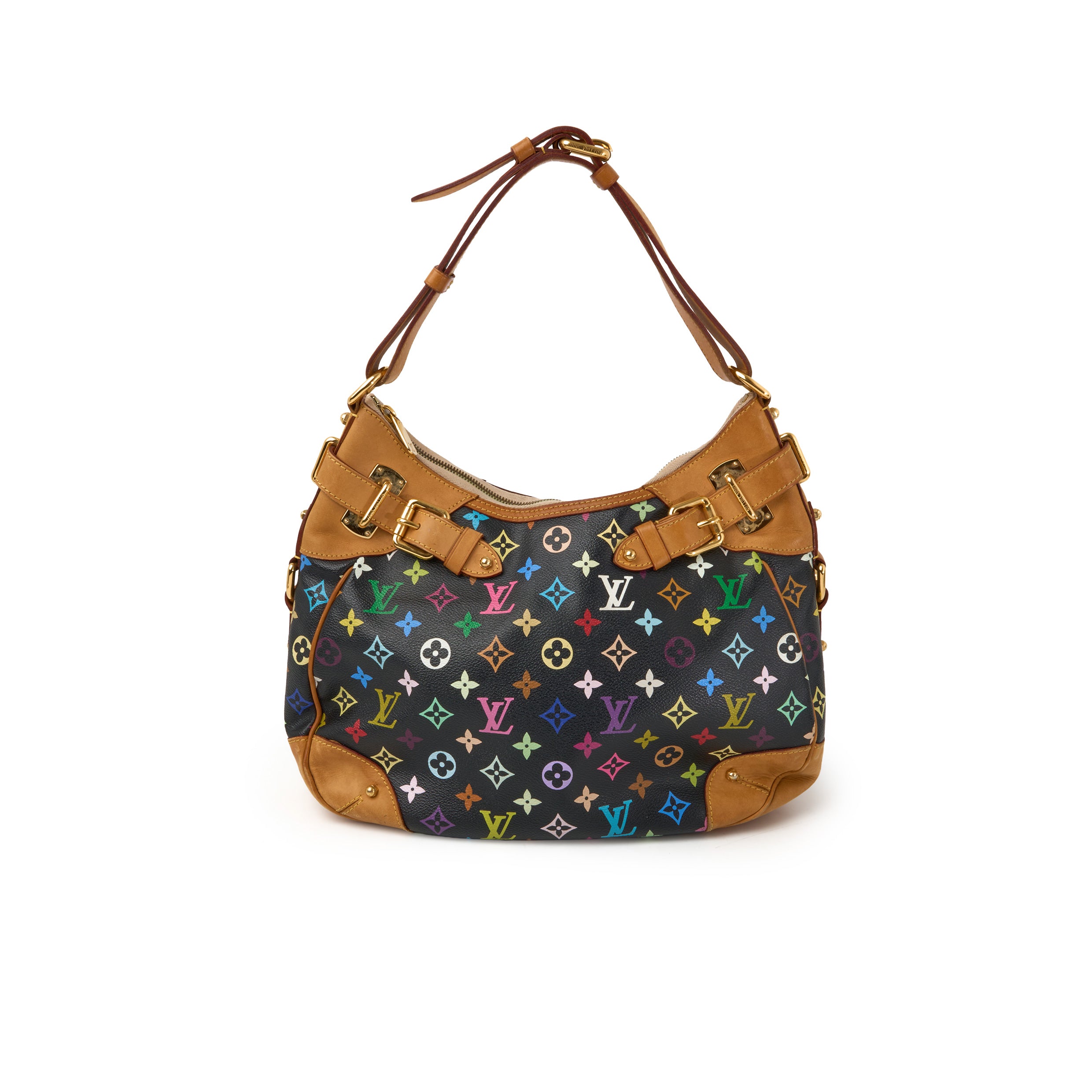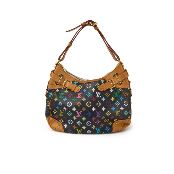 NeuwertigDie Greta ist eine der selteneren Taschen aus der berühmten Multicolore-Kollektion von Louis Vuitton, entworfen in Zusammenarbeit mit dem japanischen Künstler Takashi Murakami. In der Variante Monogram Multicolore Noirbesticht die Tasche durch ihre farbenfrohen LV-Embleme auf schwarzem Canvas, kombiniert mit Vachetta-Lederbesatz und goldfarbenen Beschlägen.