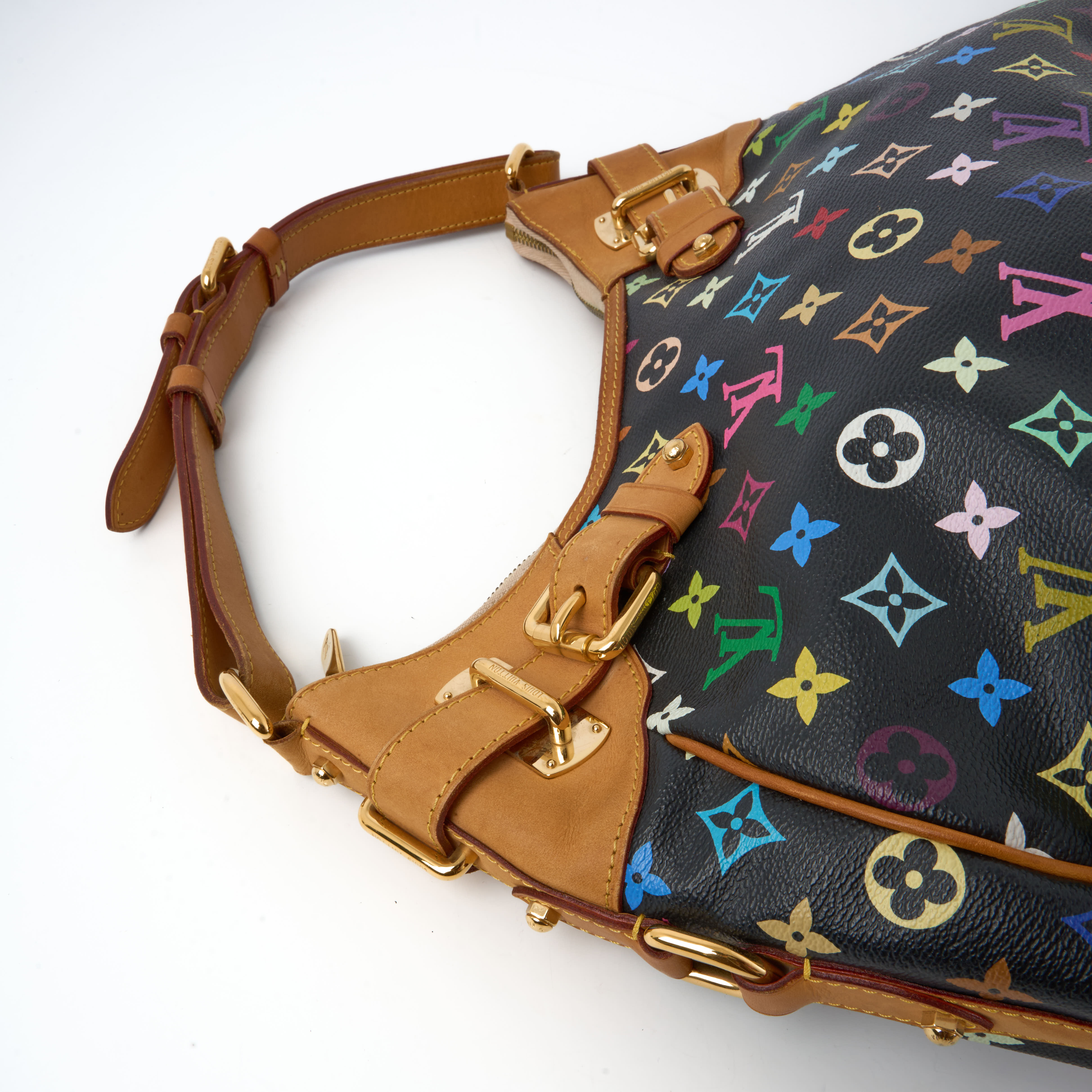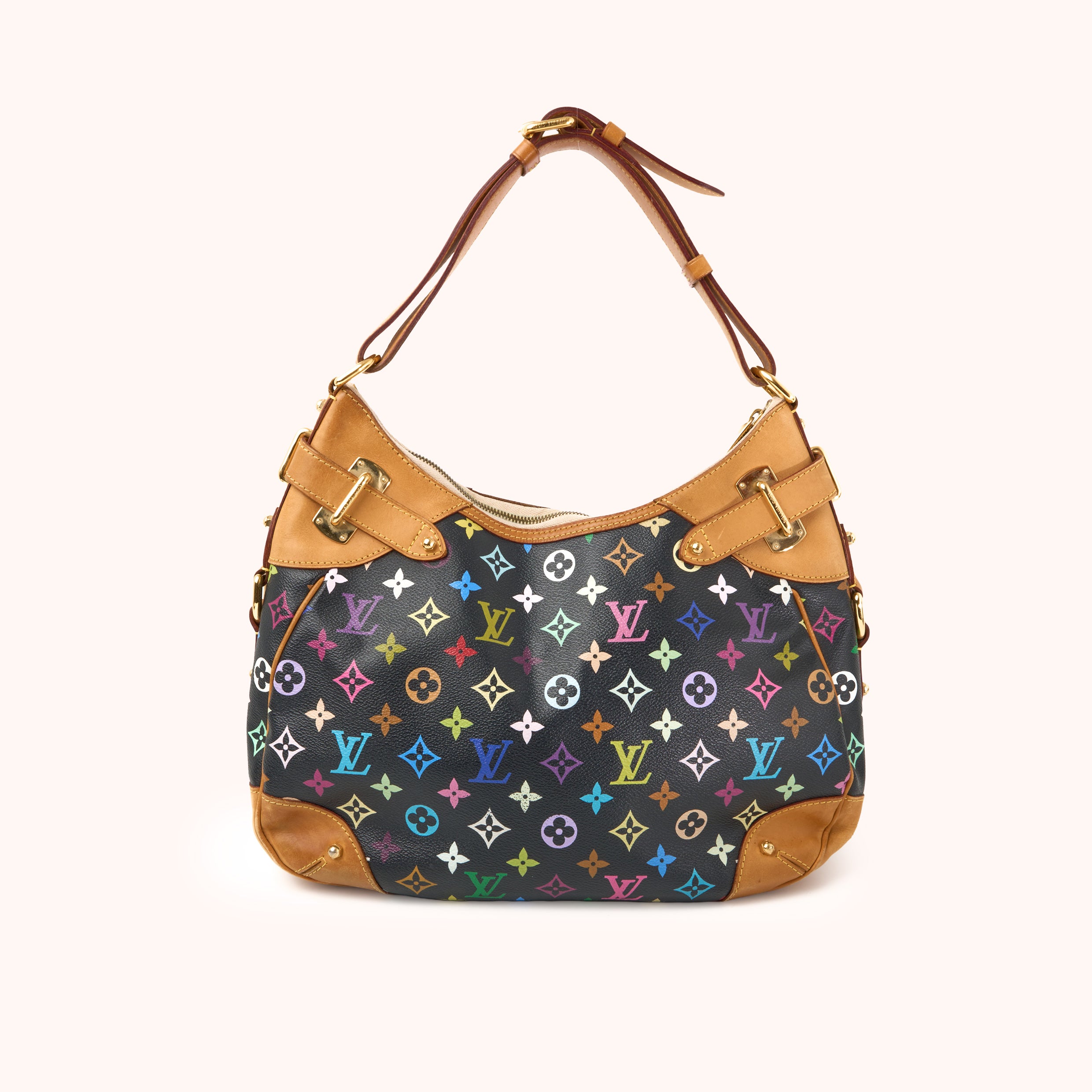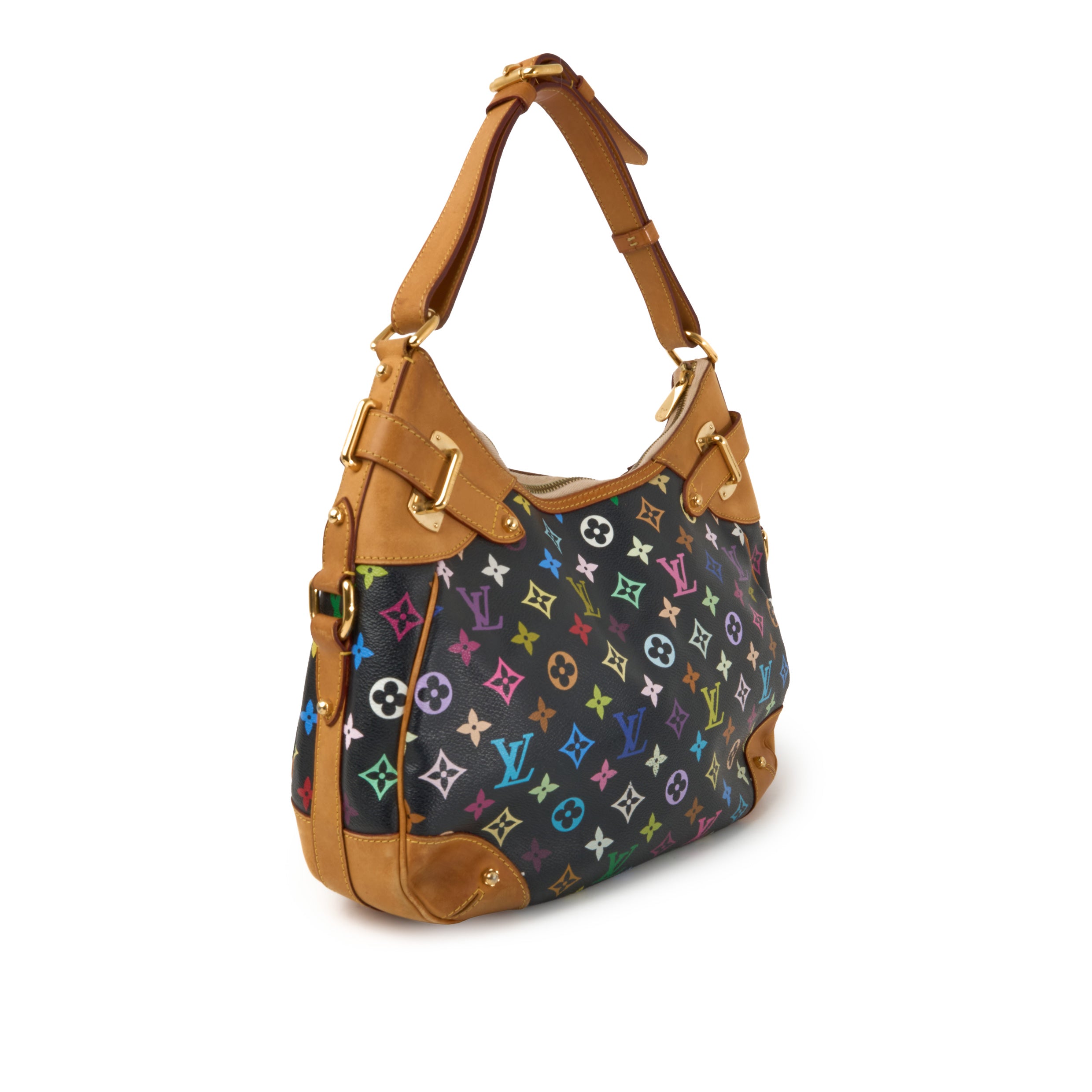 NeuwertigDie Greta ist eine der selteneren Taschen aus der berühmten Multicolore-Kollektion von Louis Vuitton, entworfen in Zusammenarbeit mit dem japanischen Künstler Takashi Murakami. In der Variante Monogram Multicolore Noirbesticht die Tasche durch ihre farbenfrohen LV-Embleme auf schwarzem Canvas, kombiniert mit Vachetta-Lederbesatz und goldfarbenen Beschlägen.