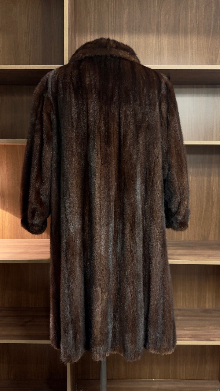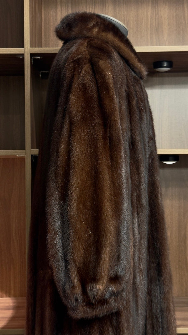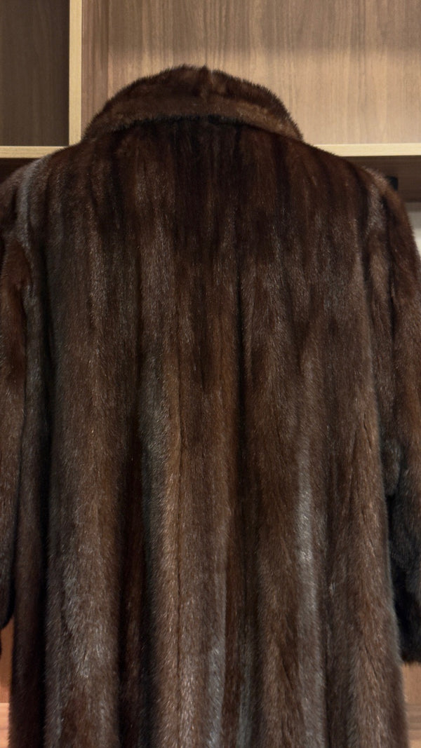 Dieser luxuriöse, lang geschnittene Vintage-Mantel aus 100% echtem Nerzfell ist ein zeitloses Statement klassischer Eleganz. Das warme, tiefbraune Naturfell besticht durch seine weiche, dichte Struktur und den wunderschön ausgearbeiteten Kragen, der dem gesamten Look eine noble, feminine Linienführung verleiht. Die verlängerte Silhouette sorgt für eine schlanke Form und schafft gleichzeitig eine eindrucksvolle Präsenz – ein Mantel, der Wärme, Stil und Luxus vereint.