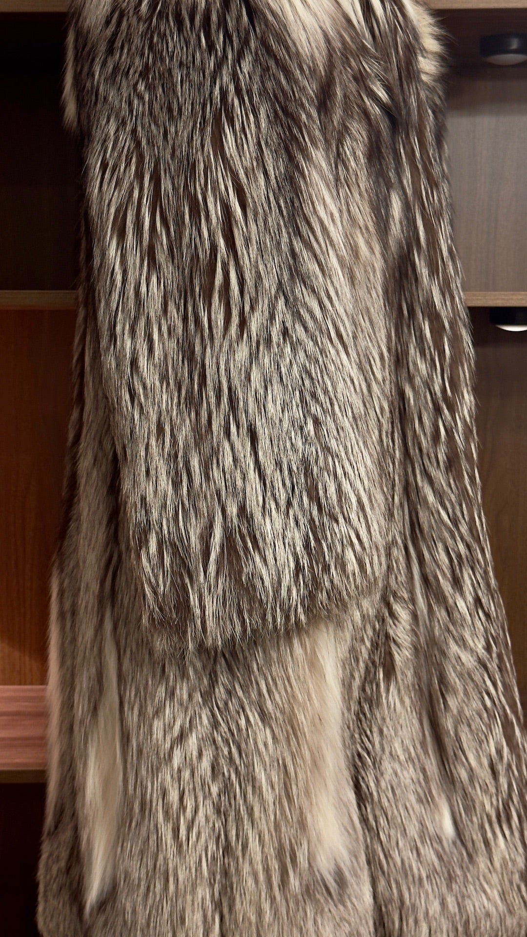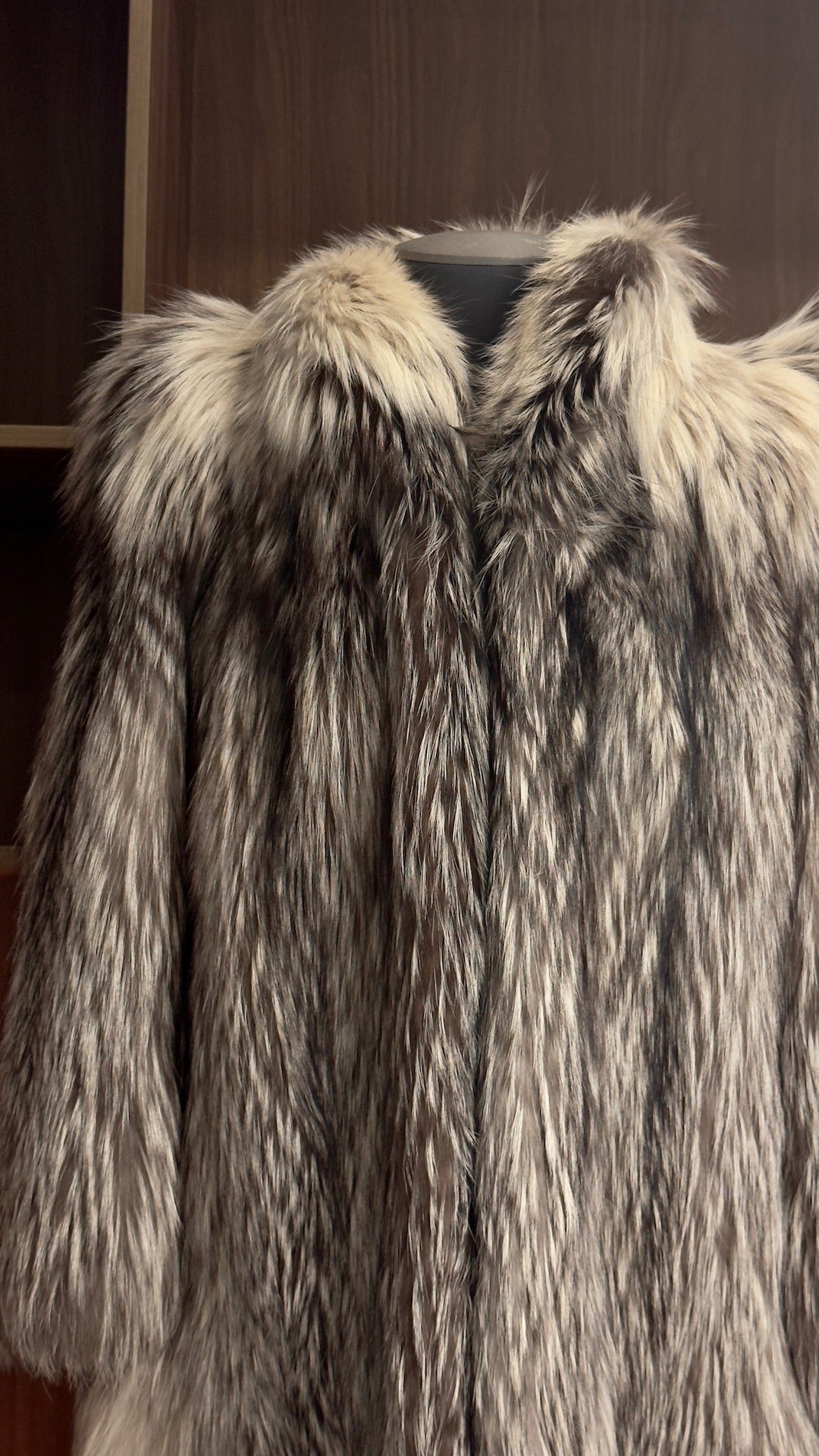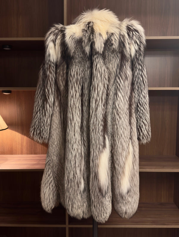 Dieser luxuriöse Mantel aus hell gefärbtem Silberfuchsfell mit feinen weißen Details im oberen Bereich verkörpert elegante Winter-Raffinesse in hochwertiger Vintage-Qualität. Die weiche, voluminöse Struktur des Fells bietet außergewöhnliche Wärme, während die helle, natürliche Farbvariation dem Mantel eine edle, arktische Leichtigkeit verleiht. Durch den klassisch langen Schnitt entsteht eine verlängerte, schlanke Silhouette, die zeitlose Eleganz mit luxuriöser Präsenz verbindet.