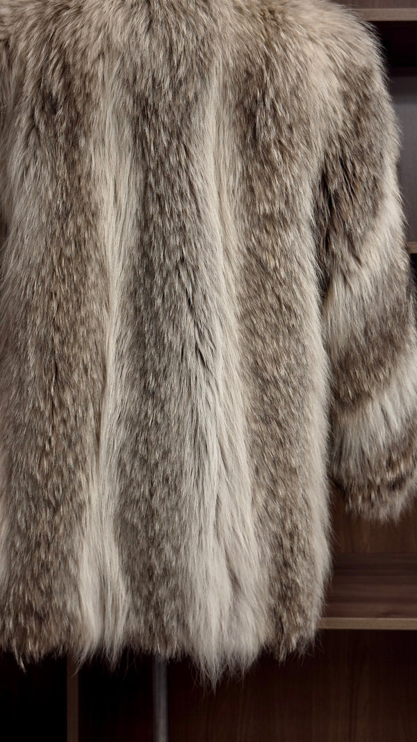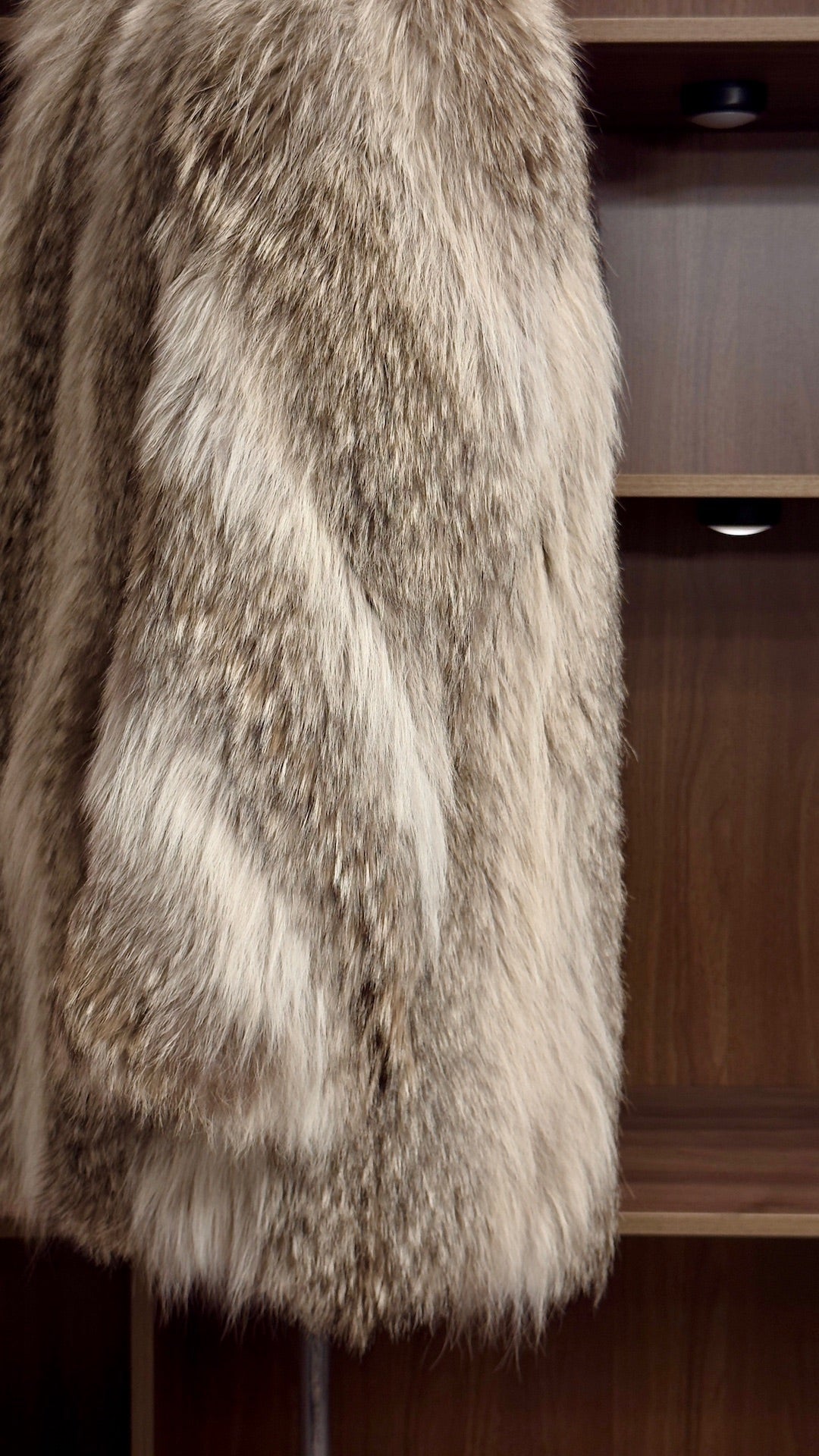 Dieser luxuriöse Mantel aus echtem Schakalfell präsentiert sich in einer warmen, natürlichen Farbgebung und besticht durch seine dichte, weiche Struktur, die hochwertige Vintage-Qualität eindrucksvoll widerspiegelt. Die lebendige Fellzeichnung verleiht dem Stück eine besondere Tiefe, während der kurze, elegant fallende Schnitt eine moderne, leicht kastige Silhouette schafft. Ein außergewöhnliches Stück für alle, die naturbelassene Felle mit Charakter schätzen.