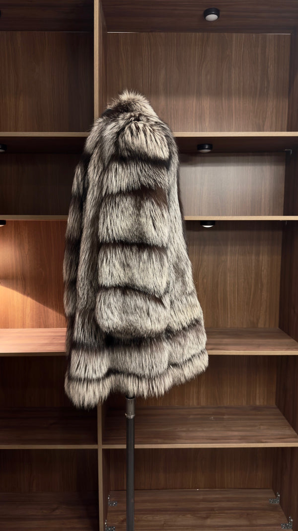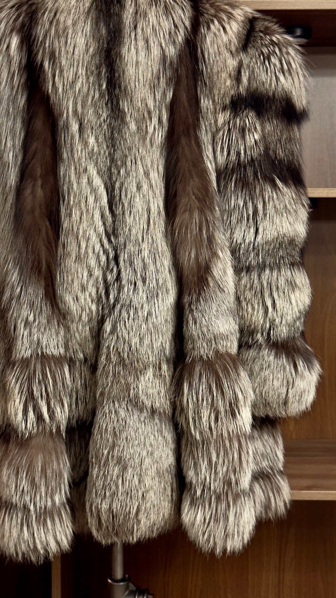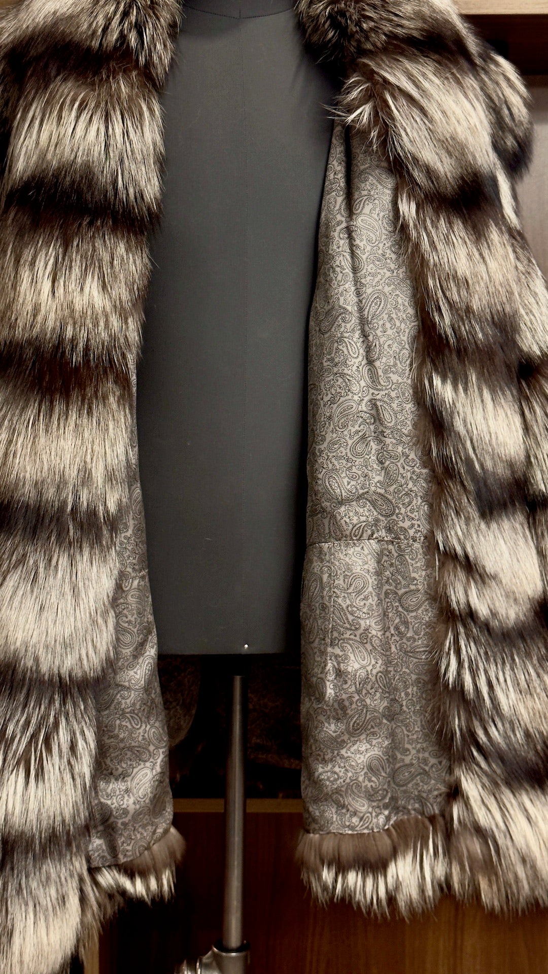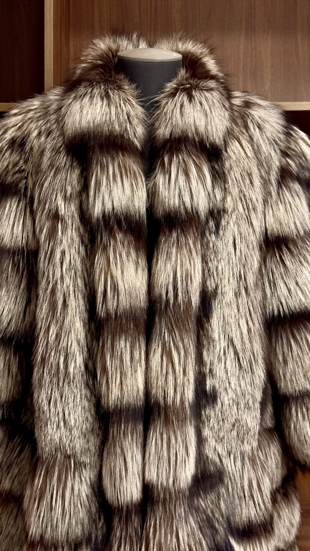 Dieser luxuriöse Mantel aus 100% echtem Silberfuchsfell beeindruckt mit seinem natürlichen Farbverlauf und einem besonders wunderschönen, voluminösen Kragen, der dem Stück eine majestätische Präsenz verleiht. Die weiche, dichte Struktur des Fells sorgt für außergewöhnliche Wärme, während der kompaktere, moderne Schnitt eine edle, kraftvolle Silhouette schafft. Ein hochwertiges, sorgfältig erhaltener Vintage-Mantel, der zeitlose Eleganz mit charakterstarker Ausstrahlung verbindet.