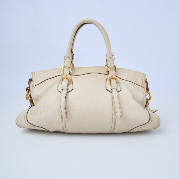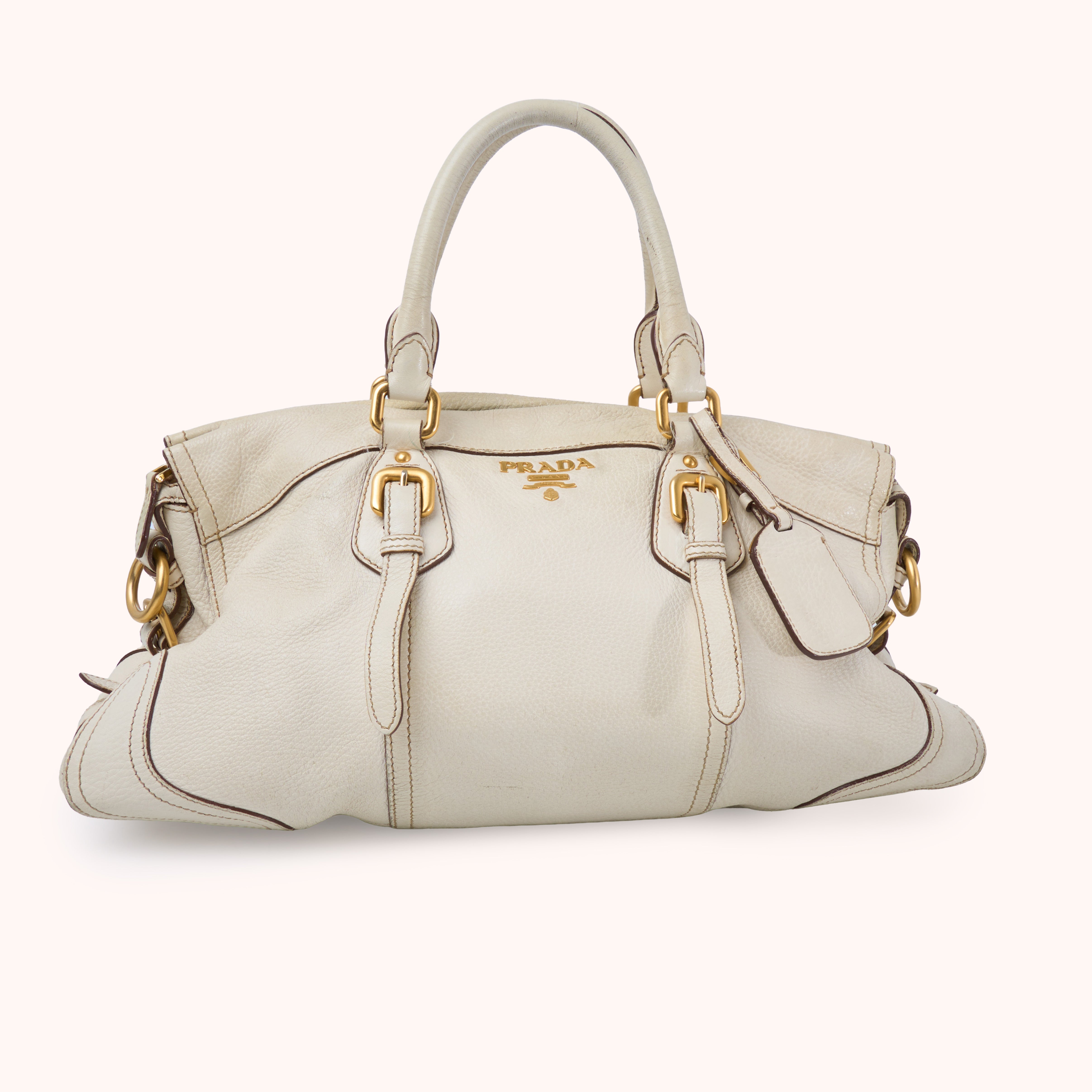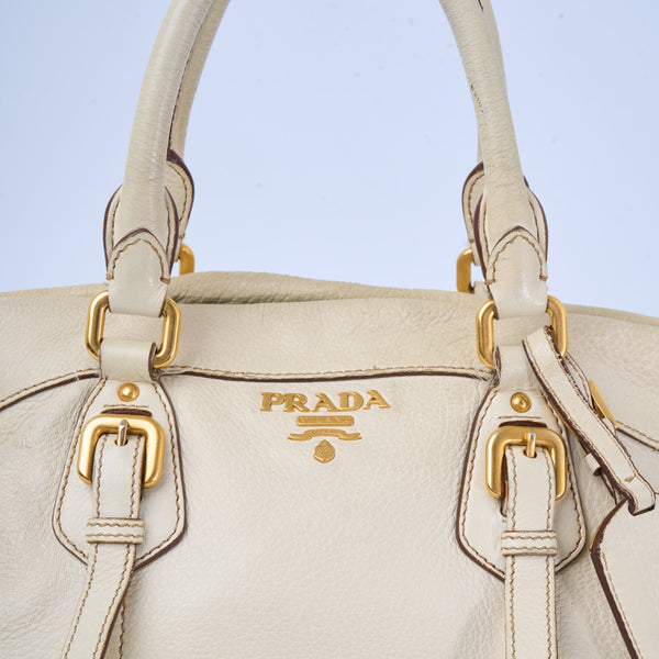 Diese elegante Prada Vitello Daino Tote in weichem, genarbtem Leder ist der Inbegriff von zeitloser italienischer Handwerkskunst. Das strukturierte Design in einem warmen Beige-Ton wird durch edle goldfarbene Hardware ergänzt und passt mühelos zu klassischen wie modernen Looks.