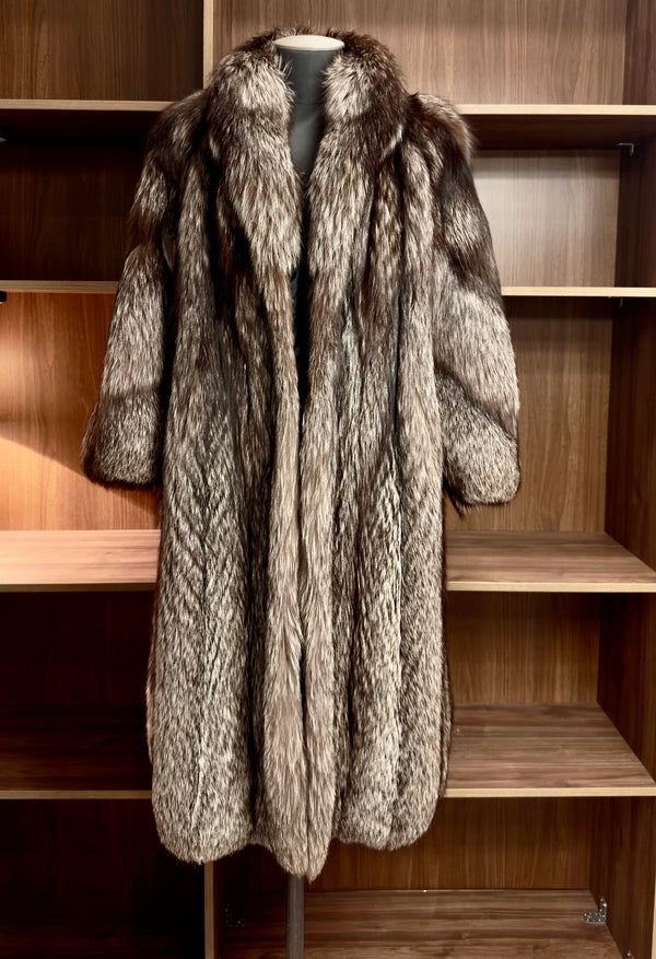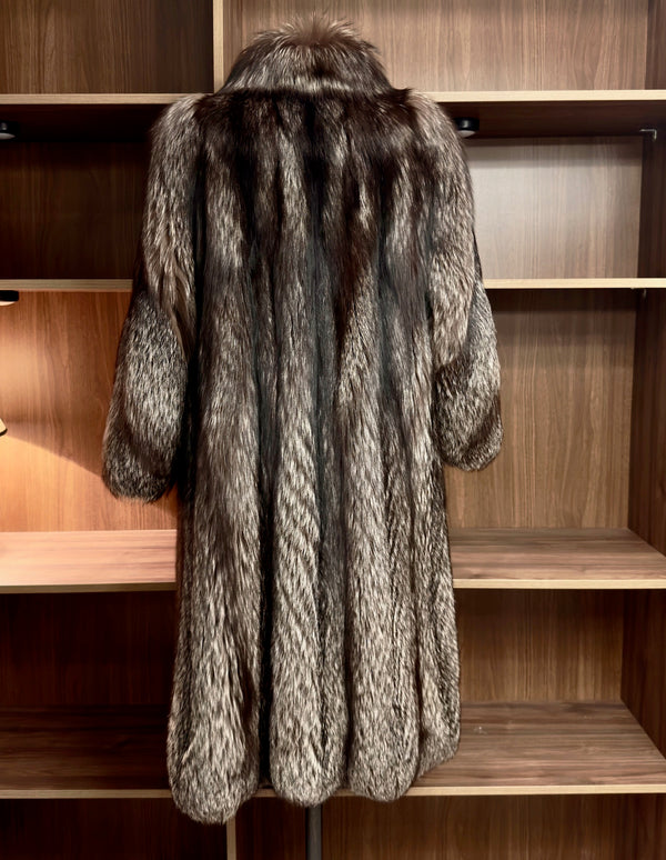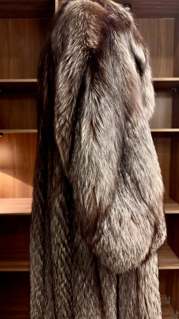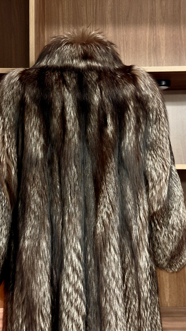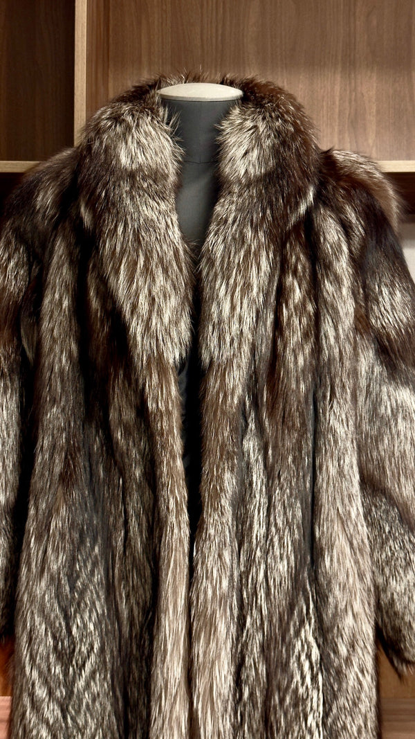 Dieser luxuriöse Mantel aus feinstem Silverfuchsfell verkörpert edle Raffinesse und hochwertige Vintage-Qualität. Die natürliche, silbrig schimmernde Farbstruktur des Fells verleiht dem Mantel Tiefe, Fülle und einen beeindruckenden Glanz. Ein besonderes Highlight ist der Mink-Besatz an den Ärmeln, der zusätzliche Exklusivität und Struktur bietet.