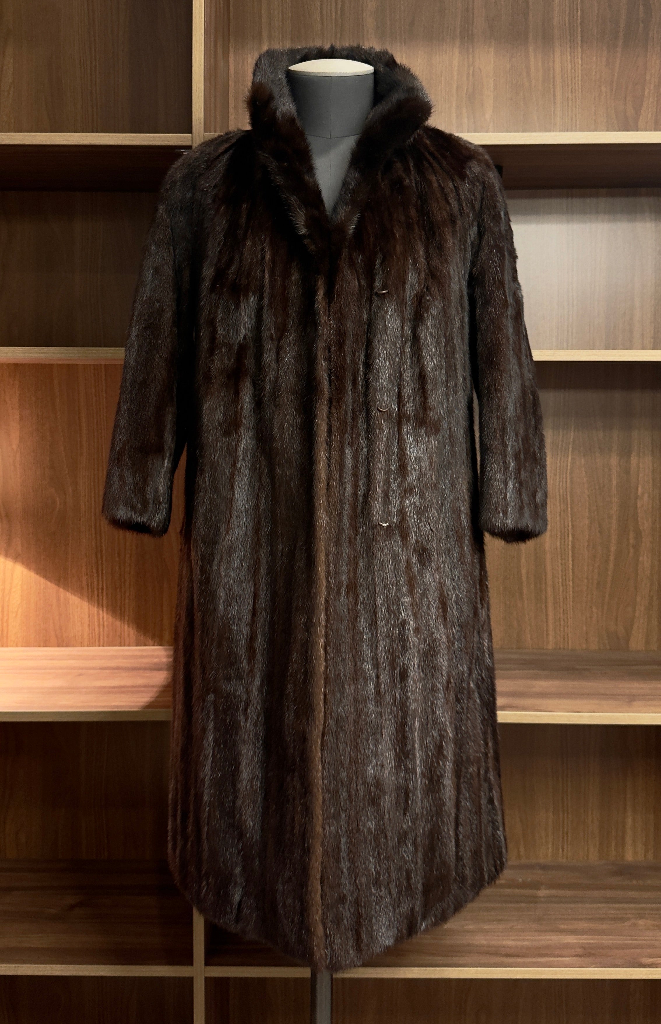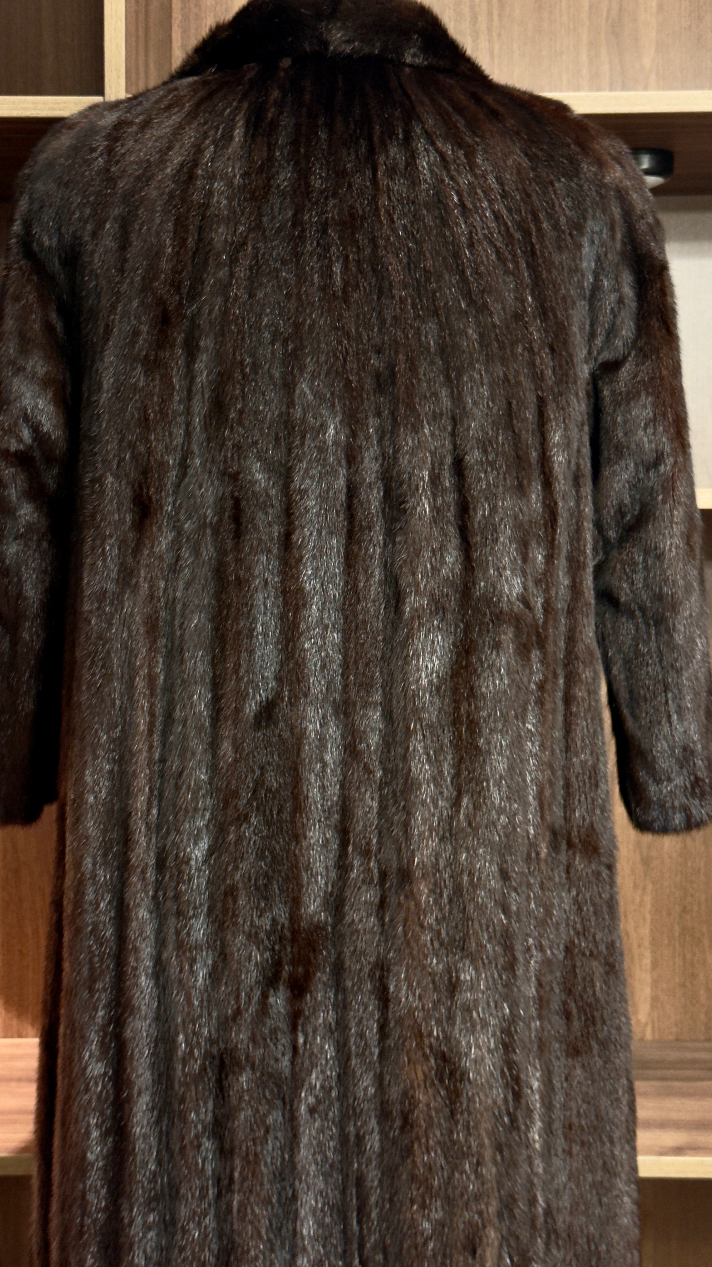 Dieser luxuriöse Mantel aus 100% echtem Nerzfell präsentiert sich in einem tiefen, glänzenden Dunkelbraun und verkörpert zeitlose Raffinesse in hochwertiger Vintage-Qualität. Die weiche, dichte Textur des Fells verleiht ihm außergewöhnliche Wärme und eine elegante, geschmeidige Oberfläche. Durch seinen etwas schmalen, figurbetonten Schnitt entsteht eine verlängerte, feminine Silhouette, die klassische Eleganz mit subtiler Modernität verbindet.