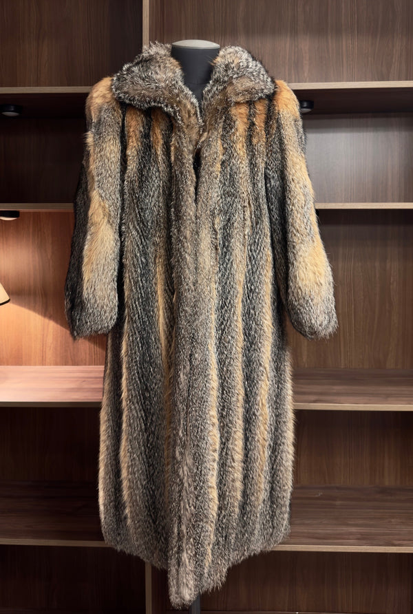Dieser außergewöhnliche Mantel aus 100% echtem Griesfuchsfell beeindruckt mit seiner natürlichen, hellen Farbstruktur und der üppigen, voluminösen Felltextur – ein echtes Statement-Piece in hochwertiger Vintage-Qualität. Die dichte, vollgriffige Struktur sorgt für eine eindrucksvolle Wärmeleistung, während der großzügige Schnitt eine kraftvolle, verlängerte Silhouette schafft, die sowohl elegant als auch markant wirkt. Ein seltener, charakterstarker Mantel, der die natürliche Schönheit des Griesfuchses eindrucksvoll zur Geltung bringt.