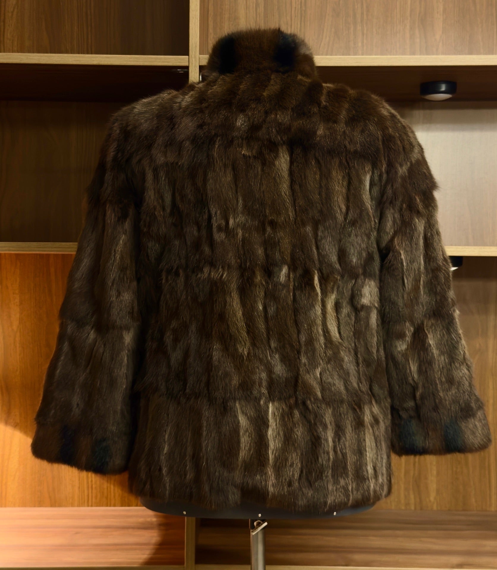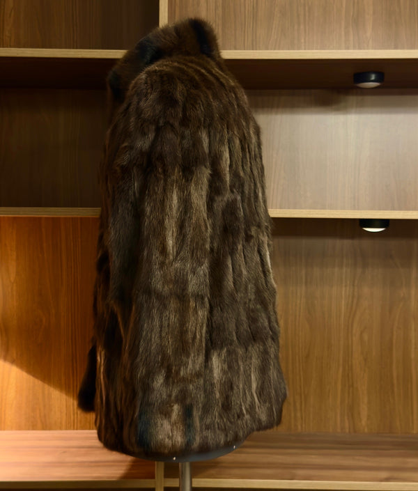 Dieser luxuriöse Mantel aus 100% echtem Marderfell präsentiert sich in einem warmen, naturbraunen Ton und zeichnet sich durch seine dichte, geschmeidige Fellstruktur aus. Die kompakte, kurze Länge und der fein verlaufende Schnitt verleihen diesem Vintage-Stück eine zeitlose, feminine Silhouette. Durch die hochwertige Verarbeitung entsteht eine elegante, edle Optik, die sowohl klassisch als auch modern wirkt – ideal für Liebhaberinnen authentischer, charaktervoller Felle.