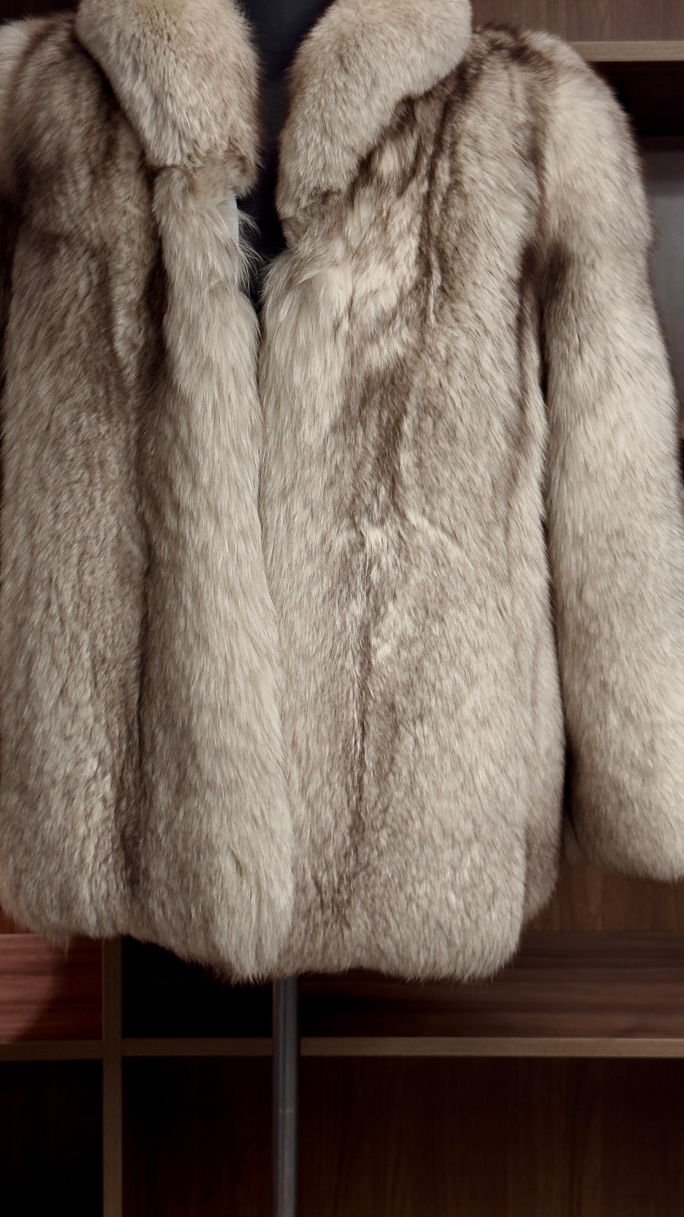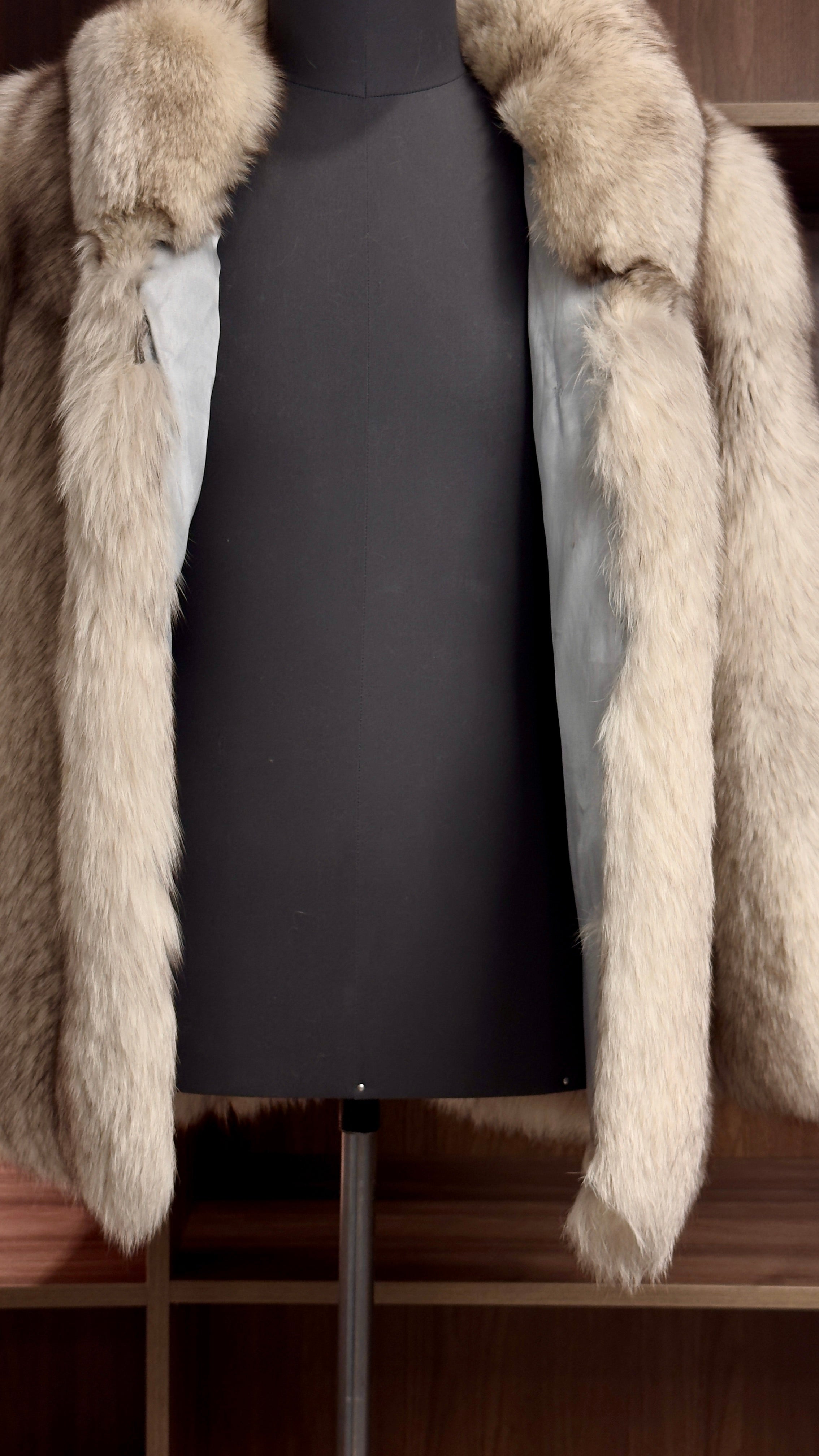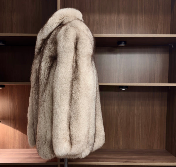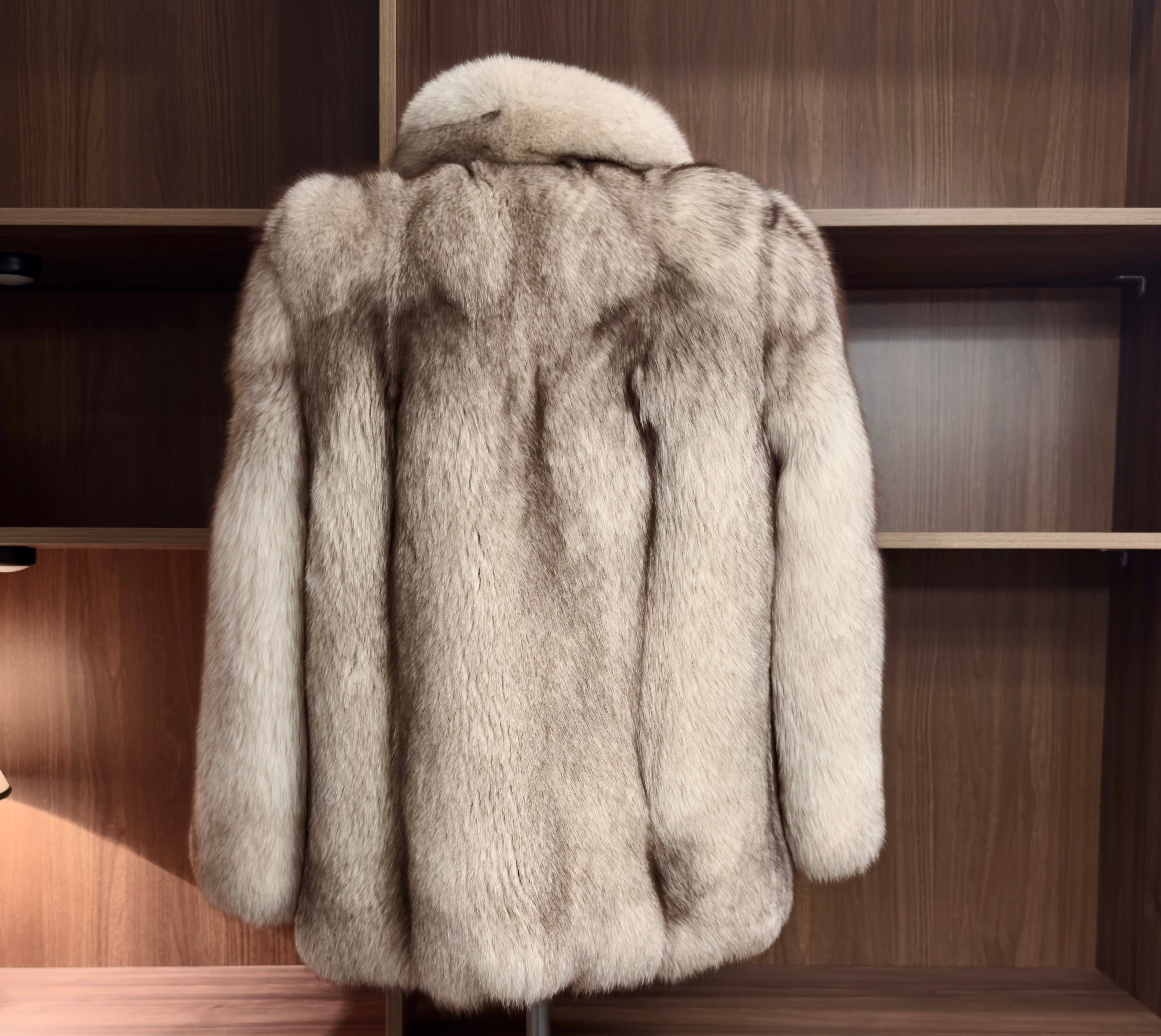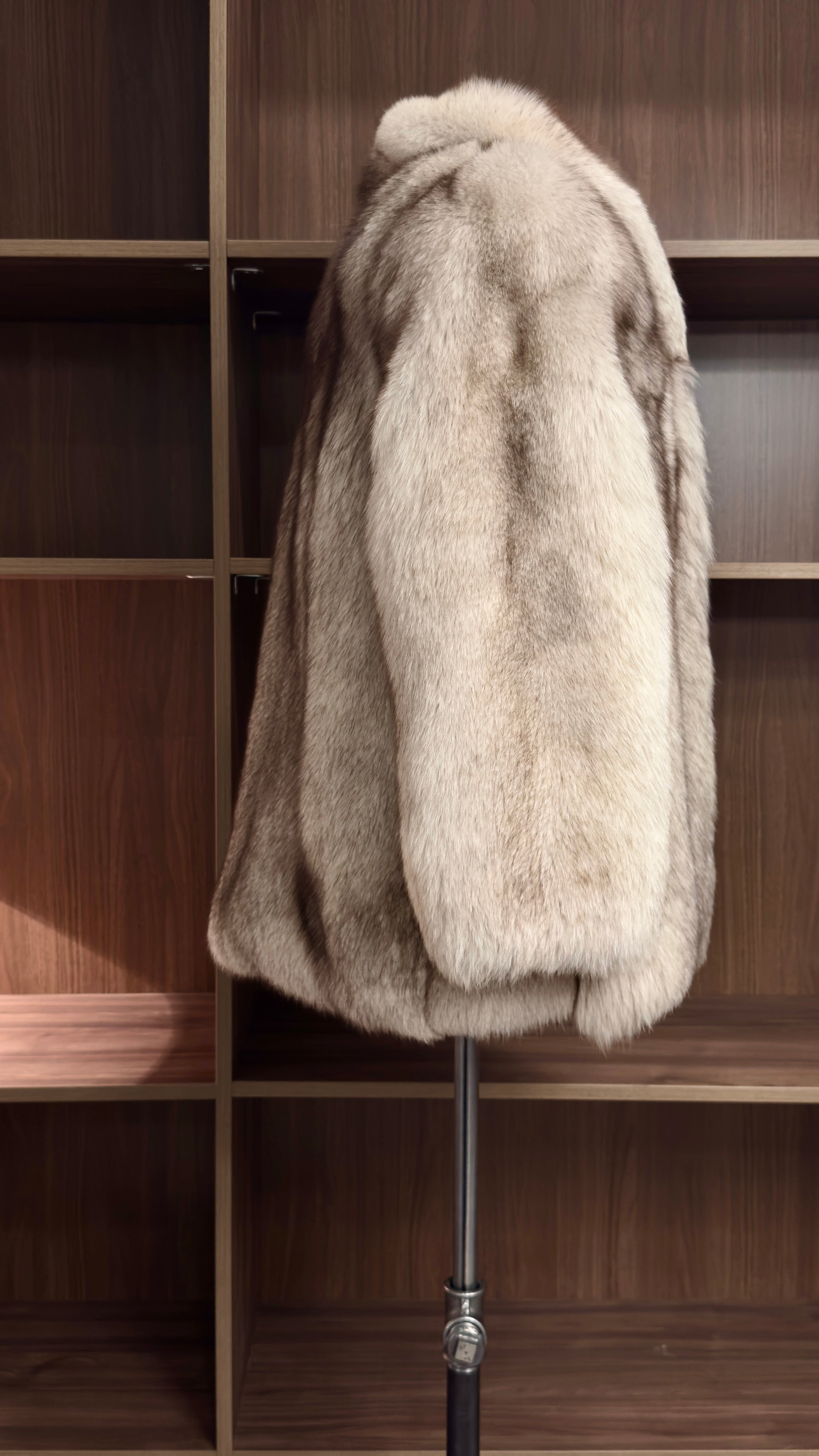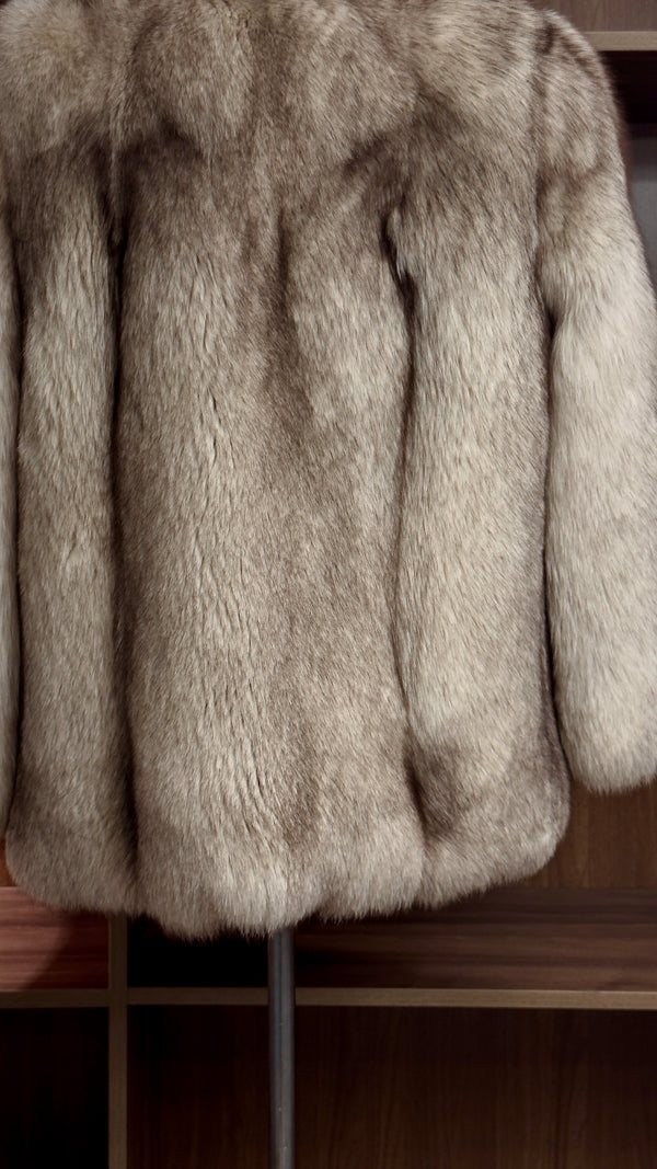 Dieser luxuriöse, kurz geschnittene Vintage-Fuchsmantel präsentiert sich in einem eleganten Weiß mit fein gesetzten braunen Akzenten, die dem Fell eine natürliche Tiefe und edle Struktur verleihen. Die weiche, dichte Textur schafft ein besonders warmes und harmonisches Gesamtbild, während der kürzere Schnitt eine moderne, leicht verspielte Silhouette zaubert. Ein hochwertiges Vintage-Stück, das zeitlose Eleganz mit markantem Charakter verbindet.